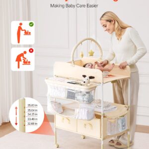 VEVOR Baby Changing Table, Foldable Diaper Change Station with 2 Fabric Drawers, Side Basket & Hanging Rod, Adjustable Height Portable Changing Table with Lockable Wheels & 2 Star Toys, Light Beige